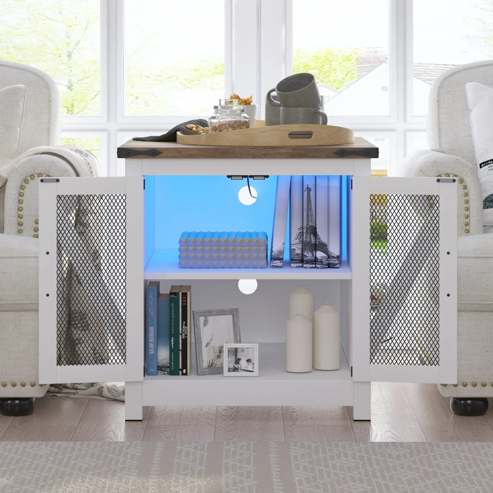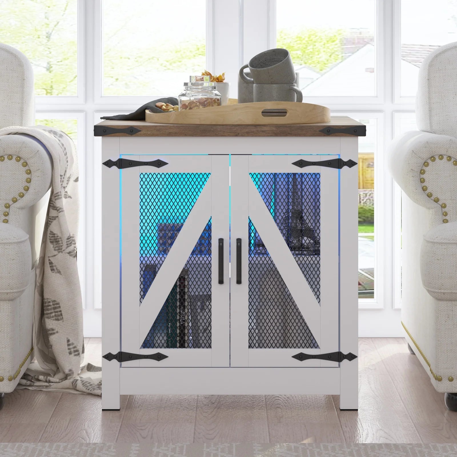 【Farmhouse Style】The combination of barn door and black iron mesh drawer, the combination of black and brown, and the black metal arrow border and silver handles, this side tables living room exudes a strong farmhouse atmosphere!