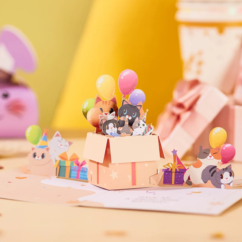 Delight cat lovers with this charming pop-up greeting card featuring adorable kittens in playful poses. Each card arrives with a coordinating envelope, making it an effortless gift solution for birthdays and celebrations. The interactive pop-up design creates a memorable unboxing moment that elevates a simple greeting into a keepsake-worthy gesture. Perfect for those who appreciate whimsical, feline-themed stationery that combines creativity with heartfelt sentiment.
