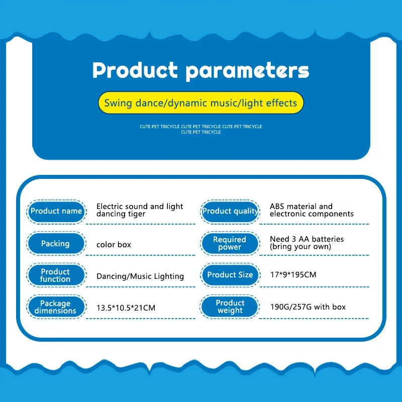 This charming dancing tiger toy combines musical accompaniment with vibrant light effects and rhythmic movement to create an engaging entertainment experience. The cute yellow cartoon design appeals to young children with its friendly, approachable aesthetic while introducing them to animal recognition. Synchronized dancing motion paired with upbeat music encourages movement imitation and rhythm exploration. Integrated lighting effects capture visual attention and support color learning during play sessions. The toy's interactive features promote sustained engagement while delivering educational value through music and movement exploration. Durable construction withstands active play and repeated use, making it a reliable choice for parents seeking toys
