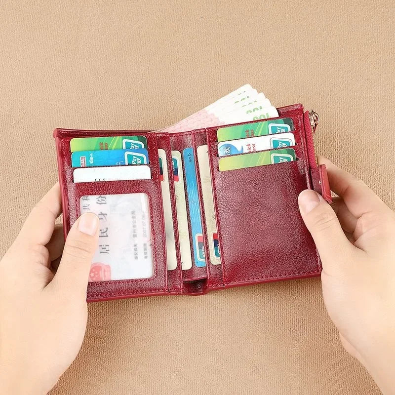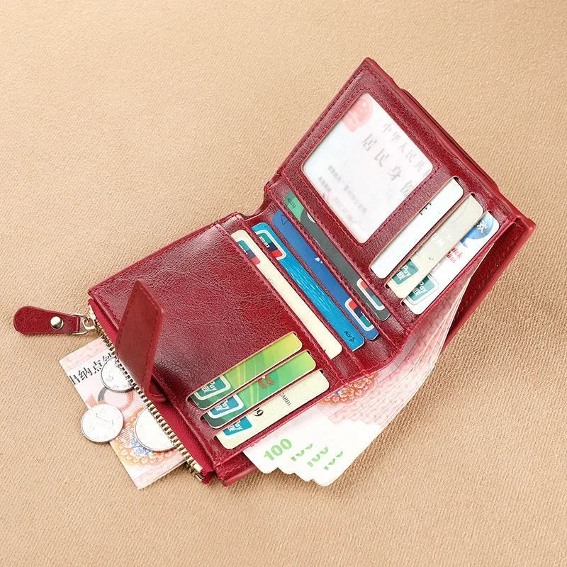 This vintage-inspired women's wallet is crafted from genuine leather and features RFID blocking technology to safeguard your cards from electronic theft. Its foldable design includes a secure zipper compartment, multiple credit card slots, and a coin purse, combining classic style with modern security and functionality for everyday use.