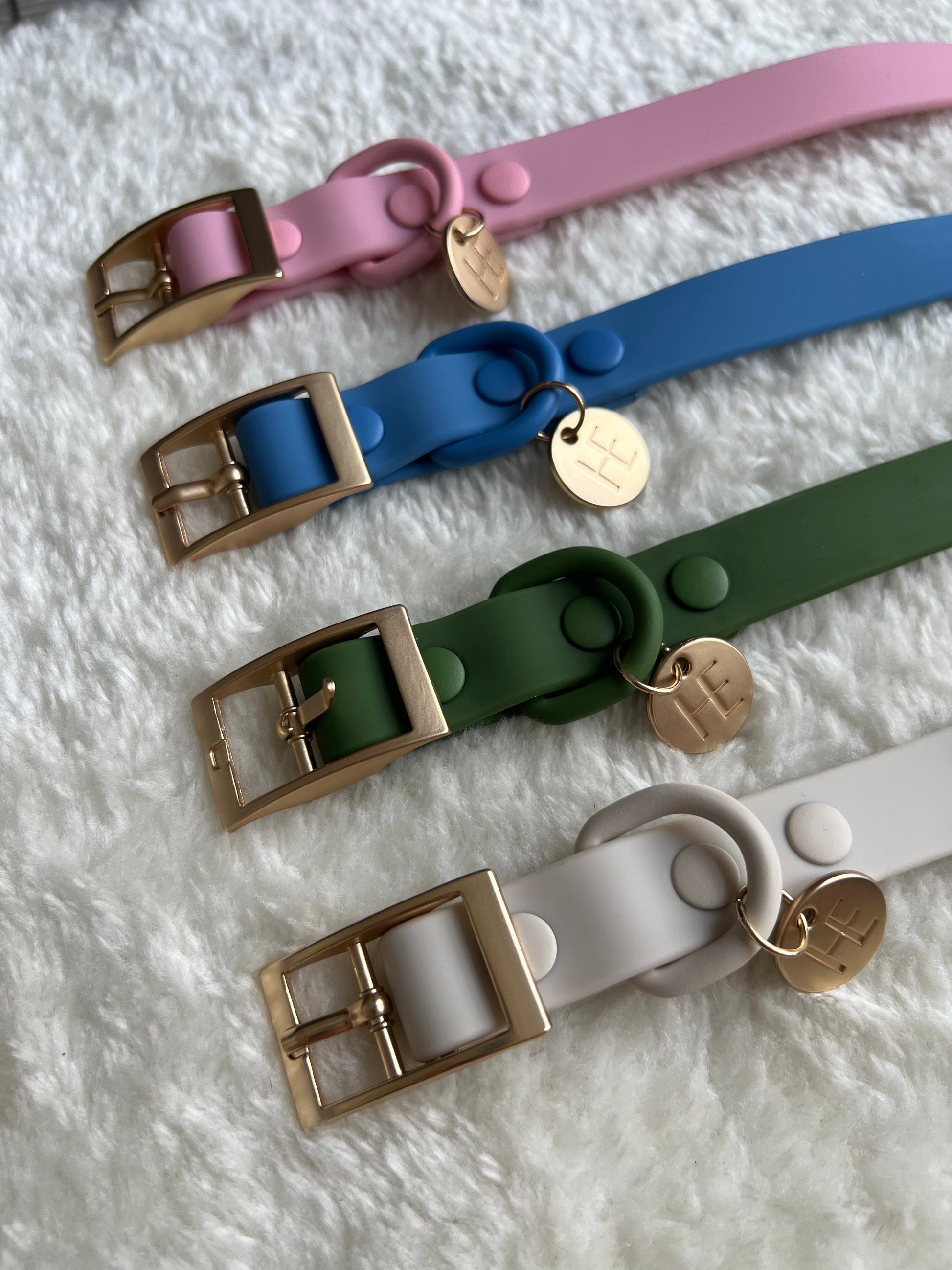 A practical fully waterproof dog collar in a soft, matte finish with complimenting Champagne gold hardware.
