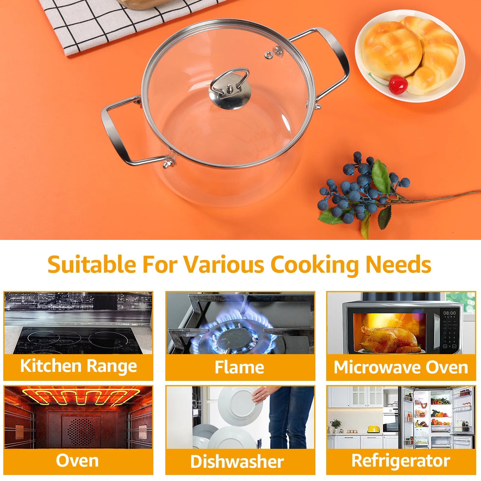 Suitable for: electric ceramic hob, gas hob, open fire, microwave, oven, refrigerator, sterilizer, dishwasher.