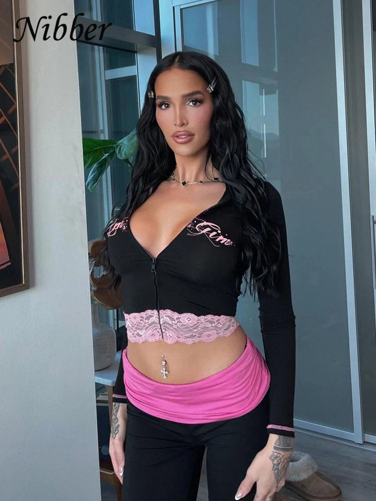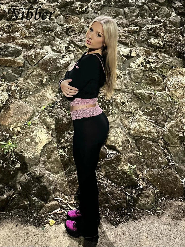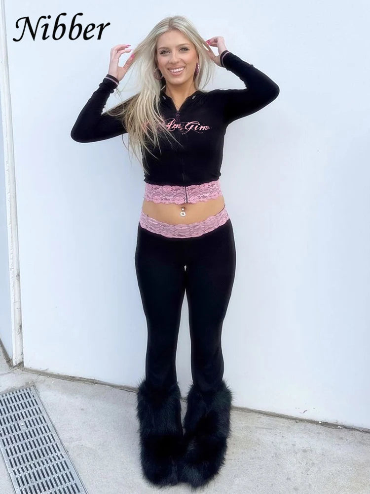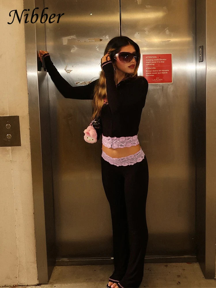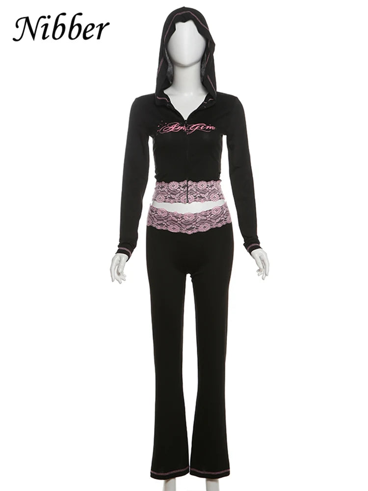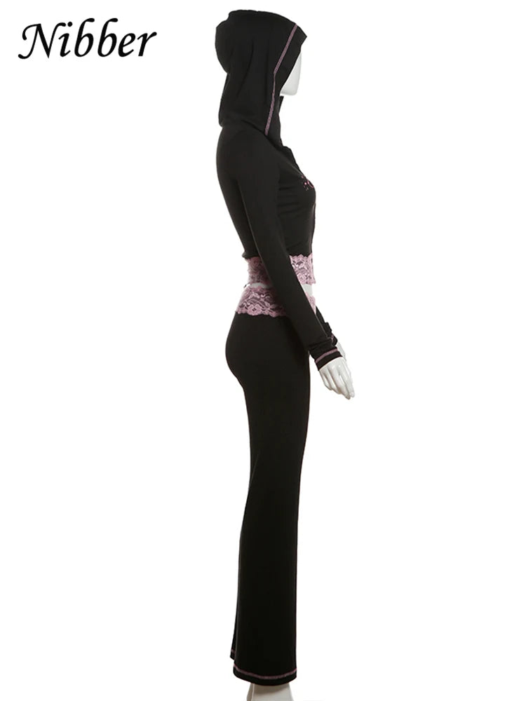 Nibber Lace Patchwork Woman 2 Piece Set Hooded Zip Crop Jacket+Patchwork Flare Pants Matching Streetwear Casual Matching Outfits