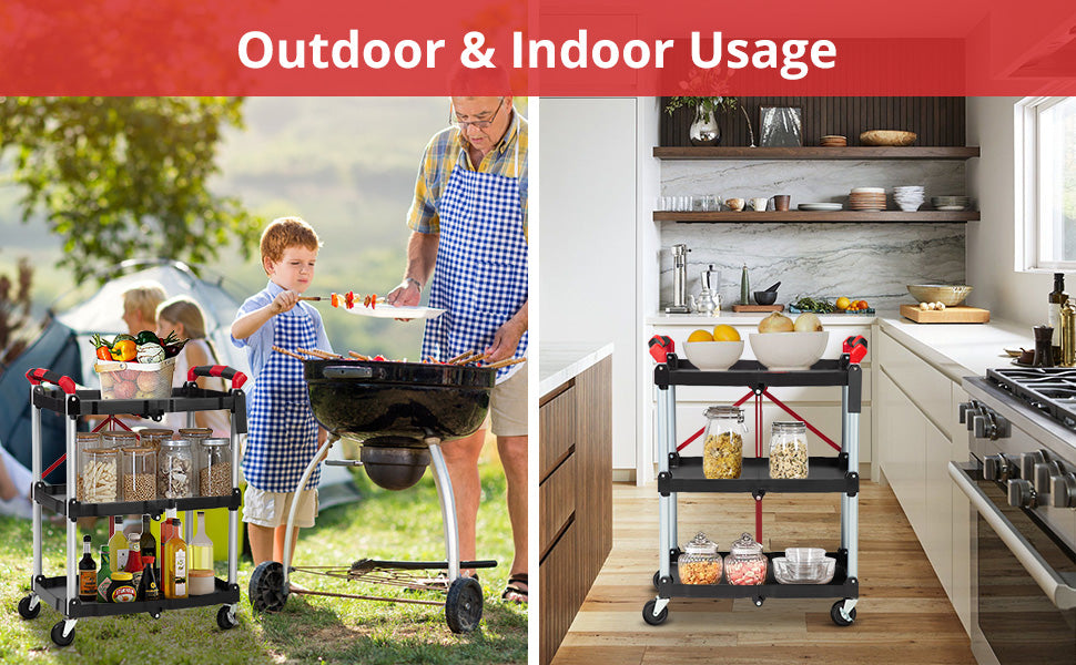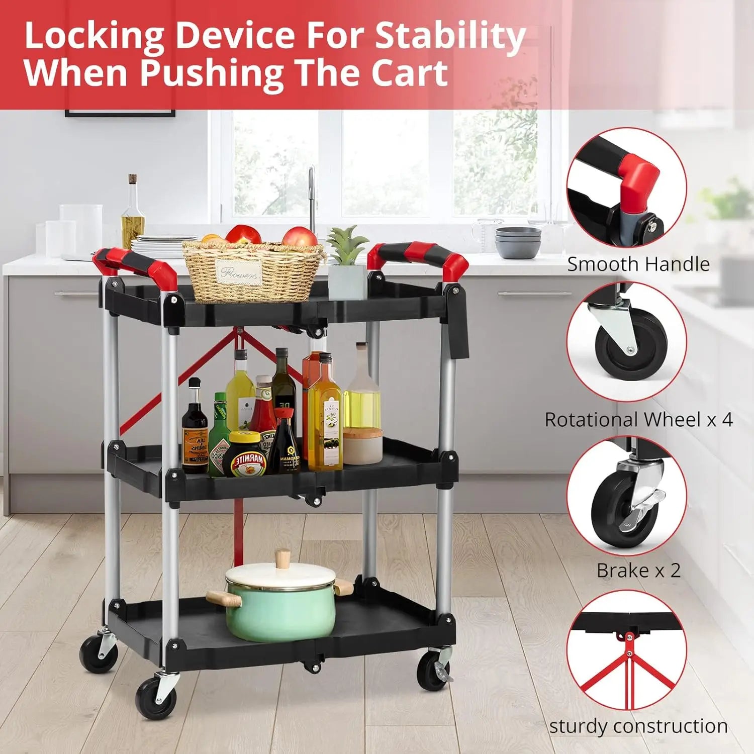 Portable Folding Service Cart, 3 Tier Folding Utility Cart , Collapsible Utility Carts for Office, Warehouse, and Home Kitchen