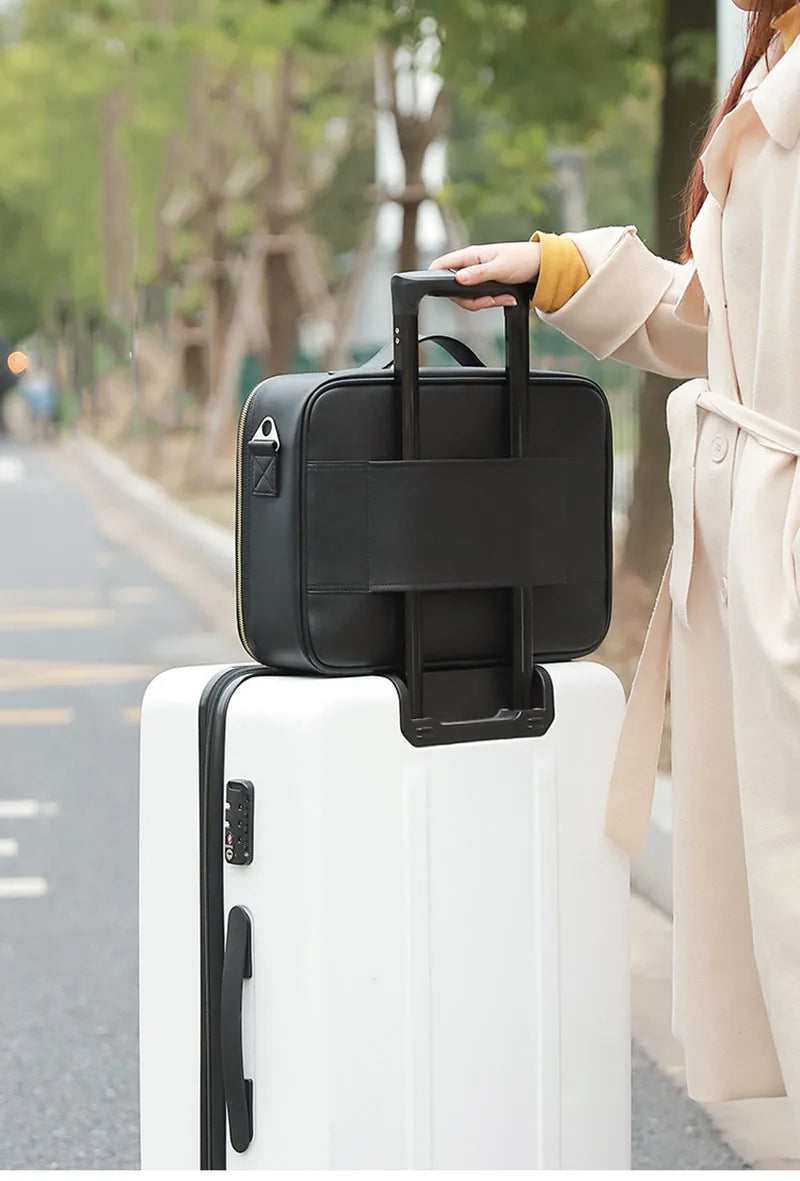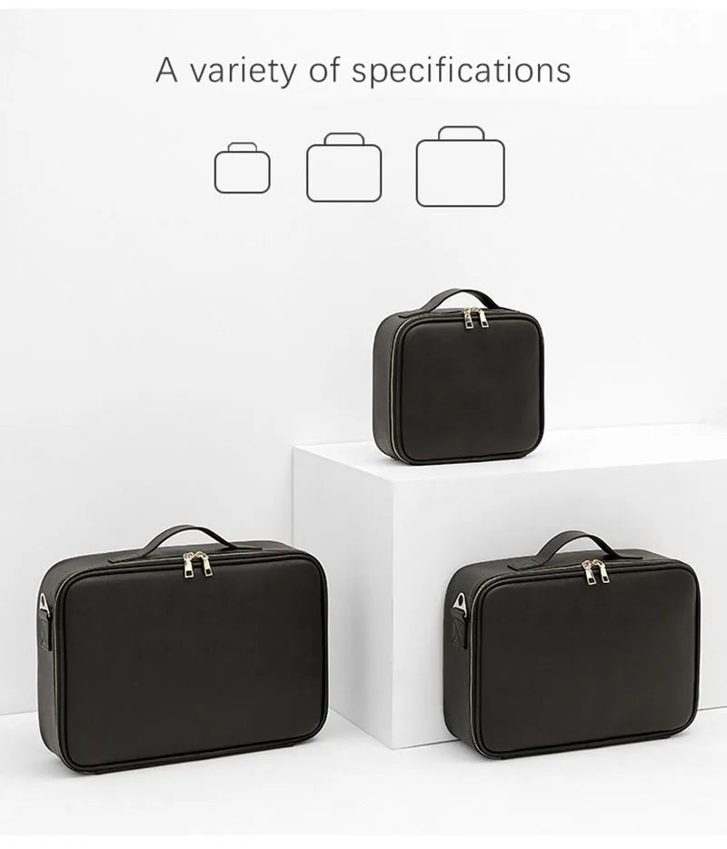 Designed for the discerning traveler, the Professional Travel Makeup Cosmetic Bag offers organized storage with multiple compartments to keep your cosmetics secure and accessible. Crafted from durable materials, it withstands the rigors of travel while protecting your beauty essentials. Its compact yet spacious design ensures convenience without sacrificing capacity, making it an essential accessory for professional and personal use on the go.