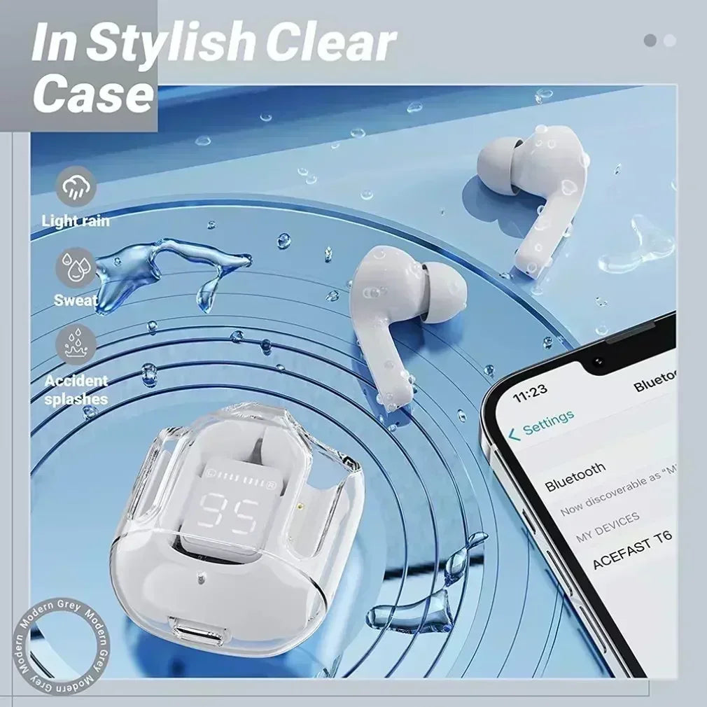 [LED Digital Display & Colorful Design] Accurate LED display of the power of charging case and both earbuds, allowing you to know the power status of the wireless earbuds and charging case at any time. This series of Bluetooth earphones with translucent charging case, futuristic texture, 5 different colors. The waterproof earbuds can effectively prevent splash damage caused by sweat and raindrops.