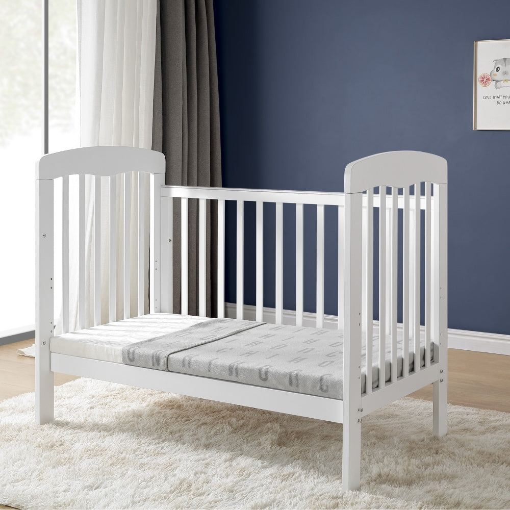 The Valencia Cot is an affordable and versatile choice for your nursery. It features an easy-to-operate drop side, clean-lined slats for visibility, and three adjustable mattress heights to grow with your baby. Available in Olive Green, Midnight Navy, and White, this classic wooden cot includes protective teething rails and a smooth finish to match any nursery theme.
